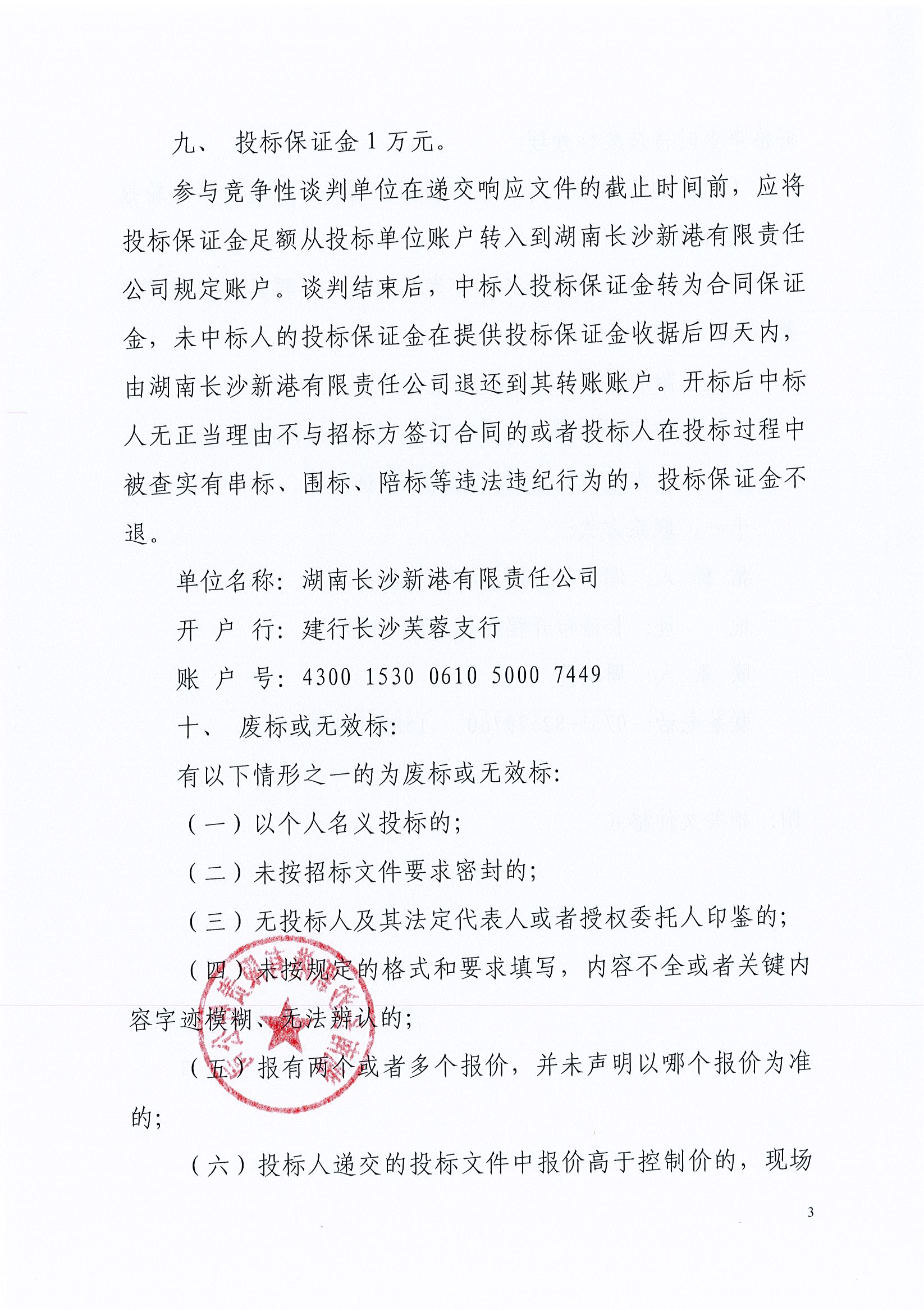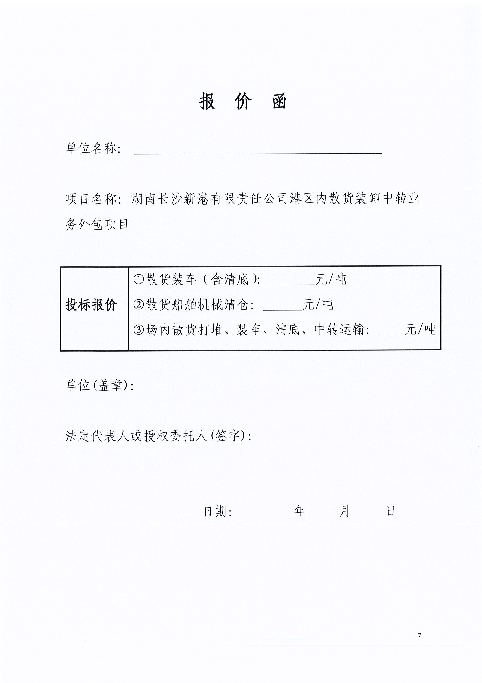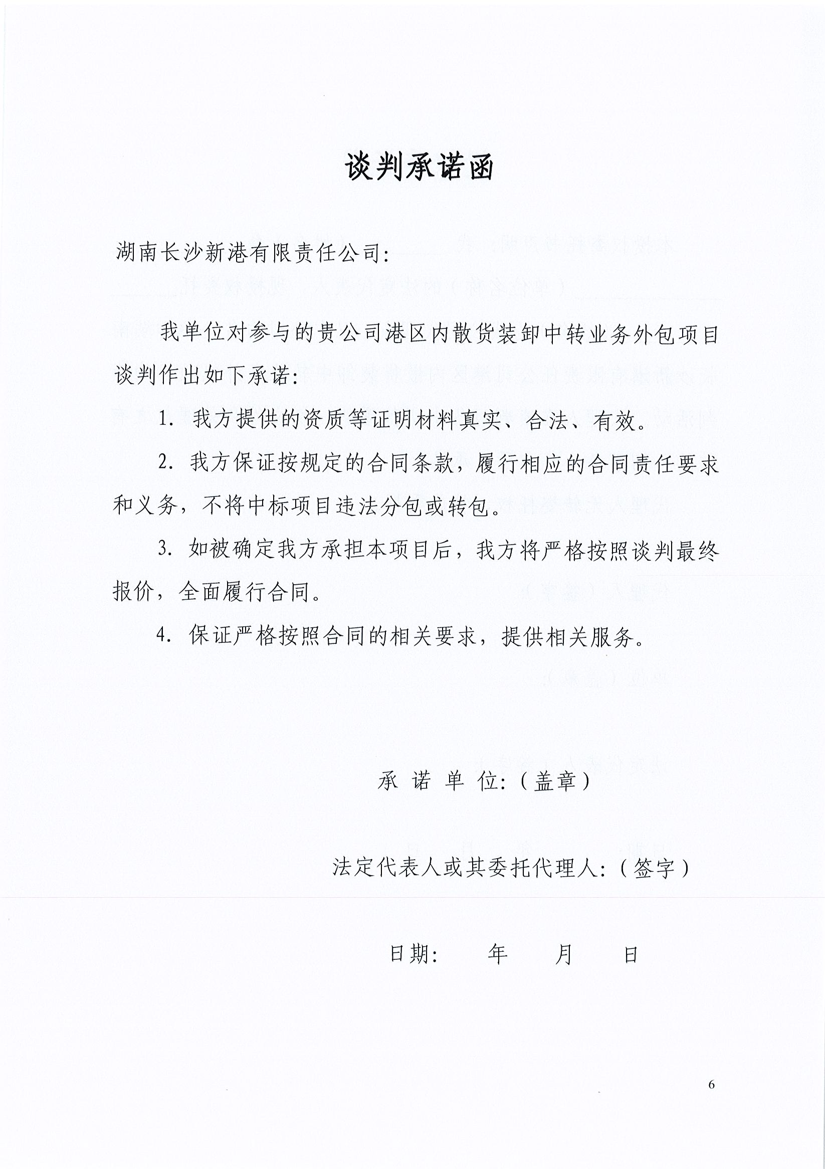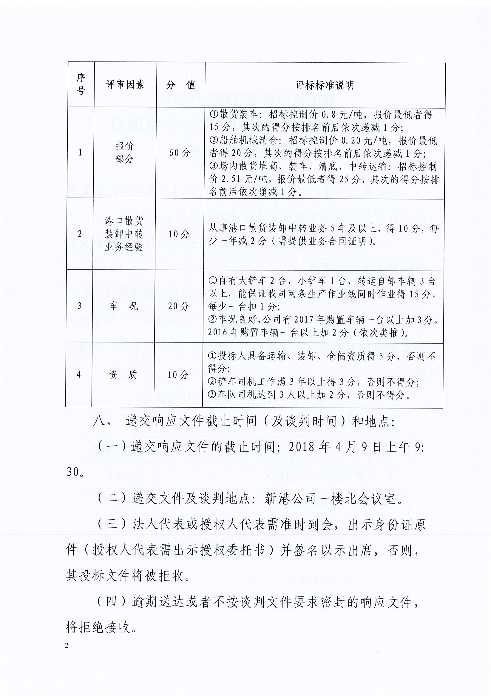 我公司決定對港區(qū)內(nèi)散貨裝卸中轉(zhuǎn)業(yè)務(wù)外包項(xiàng)目按照一般競爭性談判方式選擇外包單位,歡迎符合條件的單位參與項(xiàng)目的競爭談判。 一、 項(xiàng)目名稱:湖南長沙新港有限責(zé)任公司港區(qū)內(nèi)散貨裝卸中轉(zhuǎn)業(yè)務(wù)外包項(xiàng)目 二、 項(xiàng)目內(nèi)容: 長沙新港港區(qū)內(nèi):①散貨裝車(含清底);②散貨船舶機(jī)械清倉;③場內(nèi)散貨打堆、裝車、清底、中轉(zhuǎn)運(yùn)輸。 三、 項(xiàng)目委托期限:自簽訂合同之日起壹年。 四、 資格及資質(zhì)要求: (一)本項(xiàng)目不接受聯(lián)合體投標(biāo); (二)投標(biāo)人須自有大鏟車、小鏟車、轉(zhuǎn)運(yùn)自卸車輛,能保證我司兩條生產(chǎn)作業(yè)線同時(shí)作業(yè); (三)投標(biāo)人鏟車司機(jī)、車隊(duì)司機(jī)須持有相關(guān)職業(yè)資格證; (四)投標(biāo)人遞交響應(yīng)文件時(shí)須提交以下證明材料(復(fù)印件需加蓋公章): 1.企業(yè)法人營業(yè)執(zhí)照副本復(fù)印件; 2.法人資格證明書或具有單位公章及法定代表人簽章的授權(quán)委托書、法人身份證原件(或復(fù)印件); 3.投標(biāo)人自有車輛購置證明材料、司機(jī)職業(yè)資格證明材料復(fù)印件; 4.投標(biāo)人類似項(xiàng)目業(yè)績證明材料; 5.投標(biāo)人身份證原件及復(fù)印件。 五、招標(biāo)文件的獲取方式:招標(biāo)文件見本公告附件,投標(biāo)人在投標(biāo)截止時(shí)間前可自行下載或前往我司515室領(lǐng)取。 六、遞交響應(yīng)文件截止時(shí)間(及談判時(shí)間)和地點(diǎn): (一)遞交響應(yīng)文件的截止時(shí)間:2018年4月9日上午9:30。 (二)遞交文件及談判地點(diǎn):新港公司一樓北會議室。 (三)法人代表或授權(quán)人代表需準(zhǔn)時(shí)到會,出示身份證原件(授權(quán)人代表需出示授權(quán)委托書)并簽名以示出席,否則,其投標(biāo)文件將被拒收。 (四)逾期送達(dá)或者不按談判文件要求密封的響應(yīng)文件,將拒絕接收。 七、招 標(biāo) 方:湖南長沙新港有限責(zé)任公司 聯(lián) 系 人:周明德 聯(lián)系電話: 15874888034 2018年4月3日 附件: