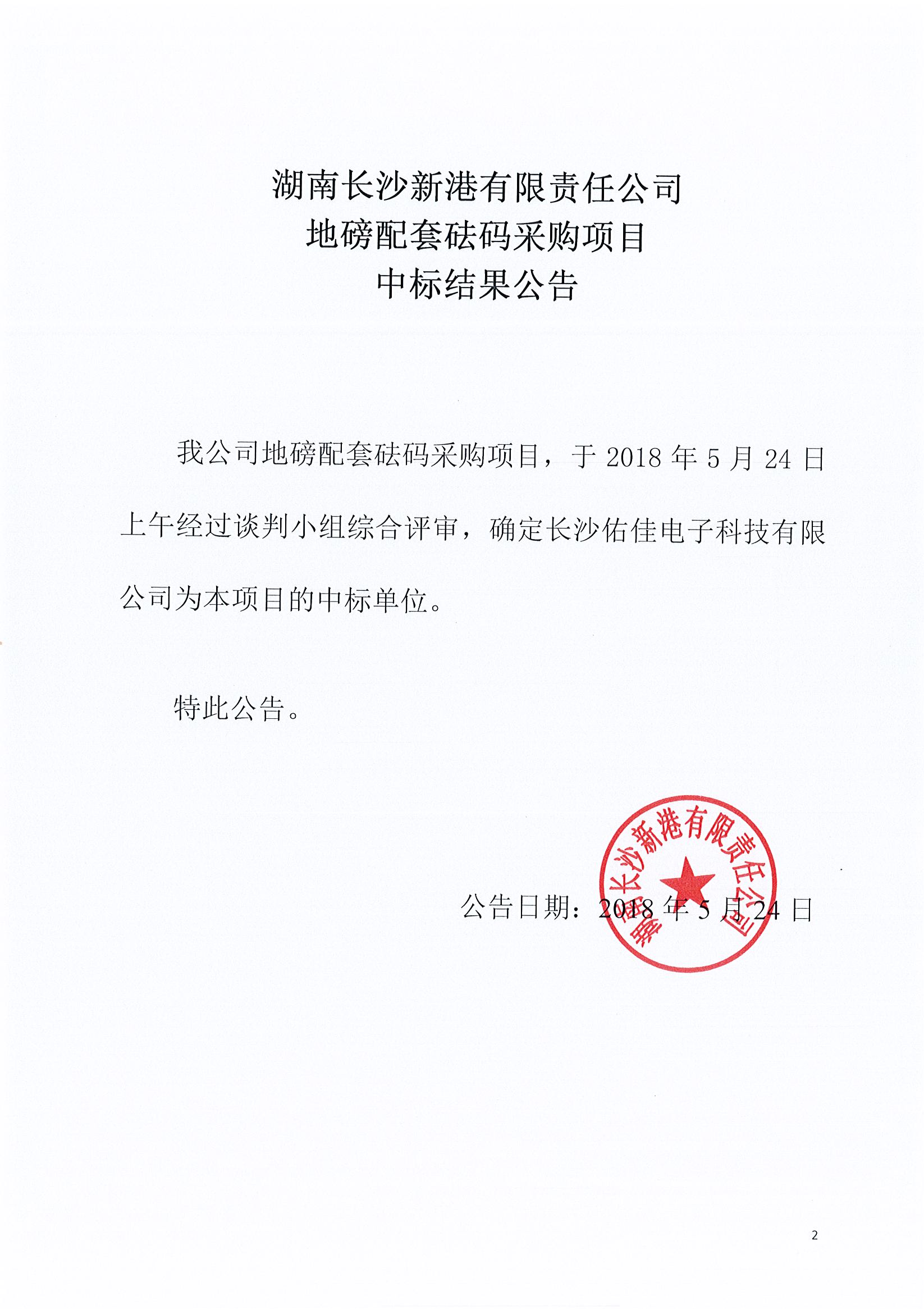 湖南長沙新港有限責(zé)任公司 地磅套砝碼采購項目中標(biāo)結(jié)果公告