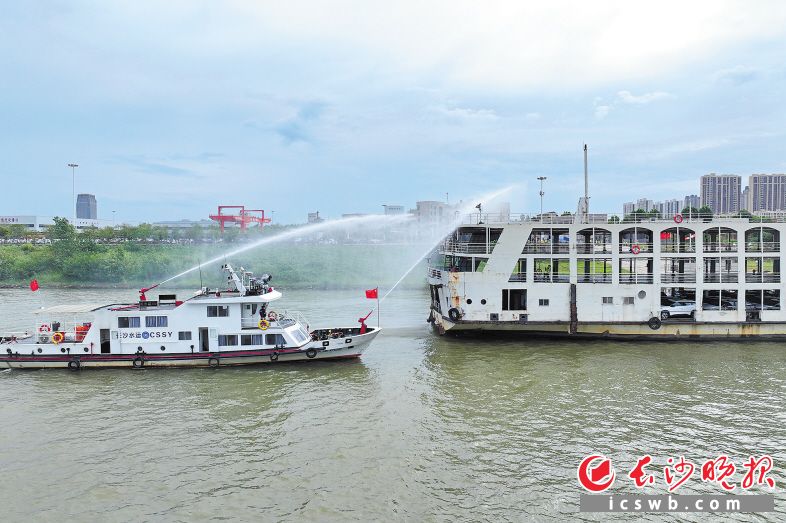 20日上午,新能源汽車起火綜合應(yīng)急演練在長沙新港公司滾裝碼頭舉行。 長沙晚報全媒體記者 王志偉 攝