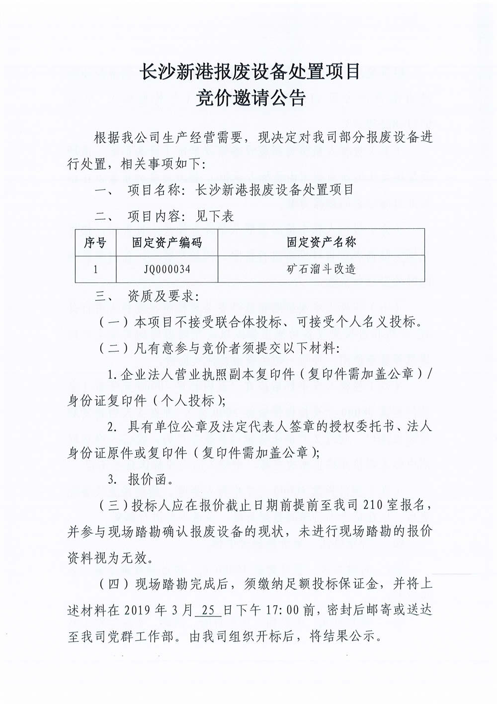 長(zhǎng)沙新港報(bào)廢設(shè)備處置項(xiàng)目競(jìng)價(jià)邀請(qǐng)公告