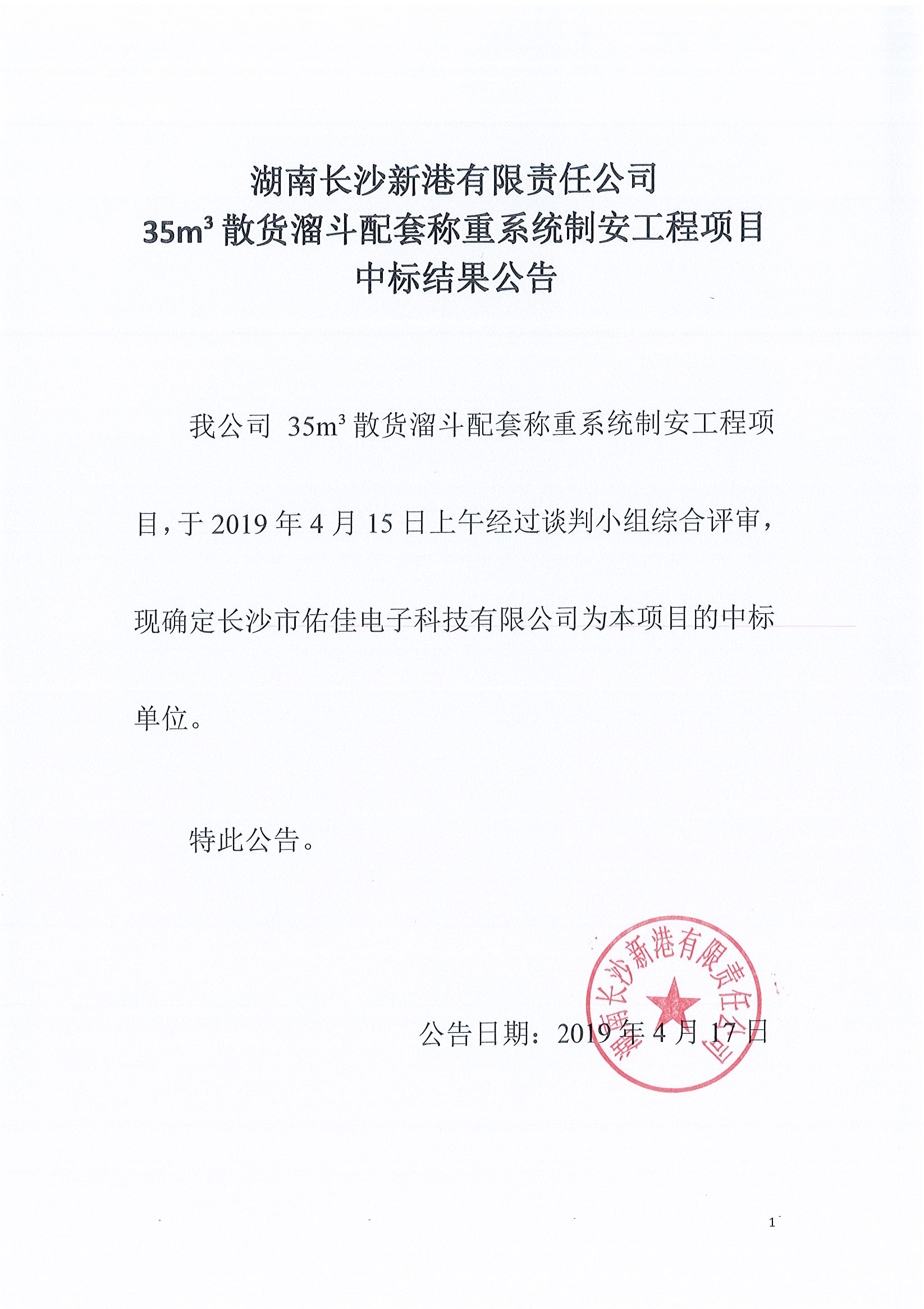 湖南長(zhǎng)沙新港有限責(zé)任公司35m³散貨溜斗配套稱(chēng)重系統(tǒng)制安工程項(xiàng)目中標(biāo)結(jié)果公告