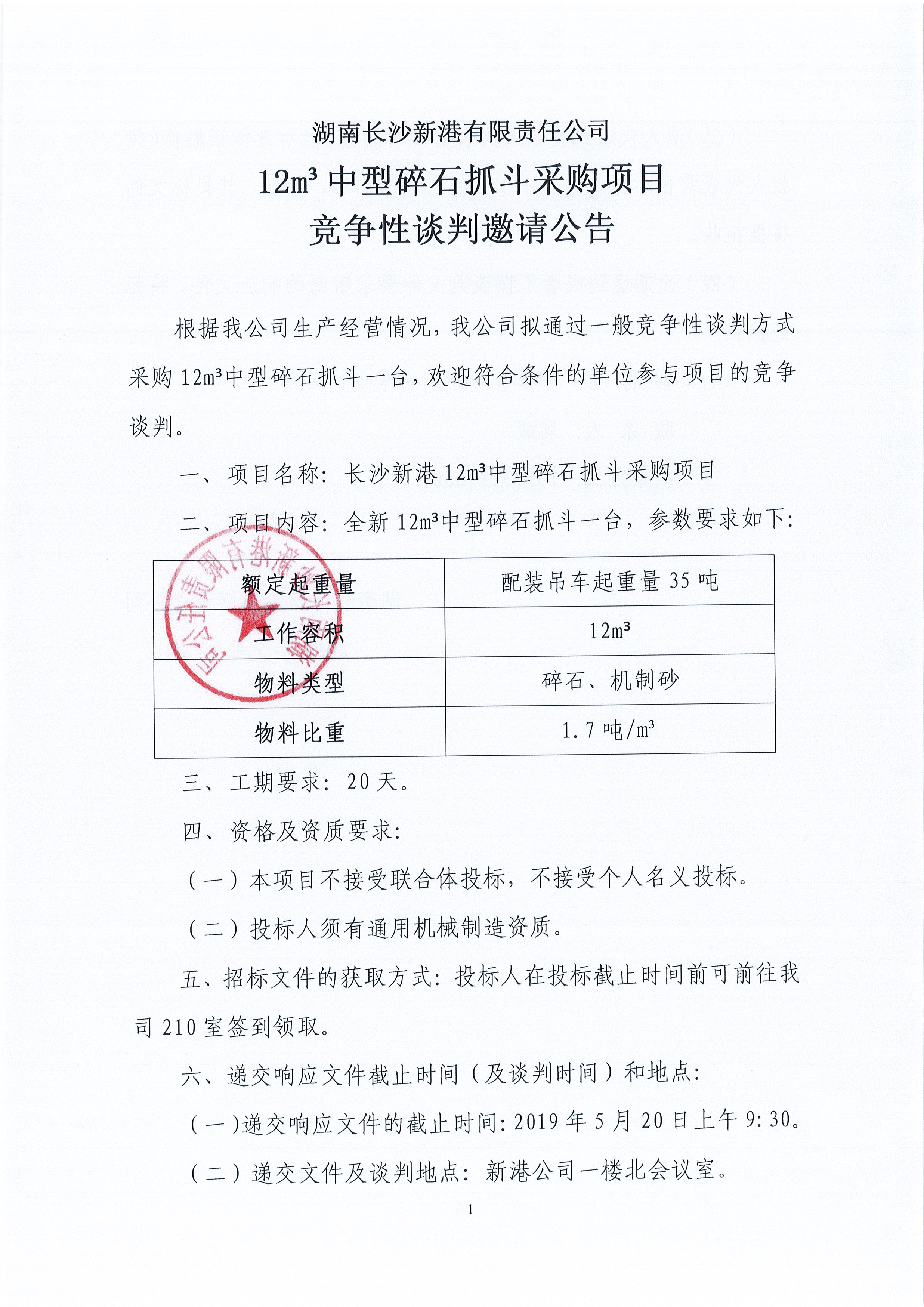 湖南長(zhǎng)沙新港有限責(zé)任公司12立方中型礦石抓斗采購(gòu)項(xiàng)目一般競(jìng)爭(zhēng)性談判邀請(qǐng)公告
