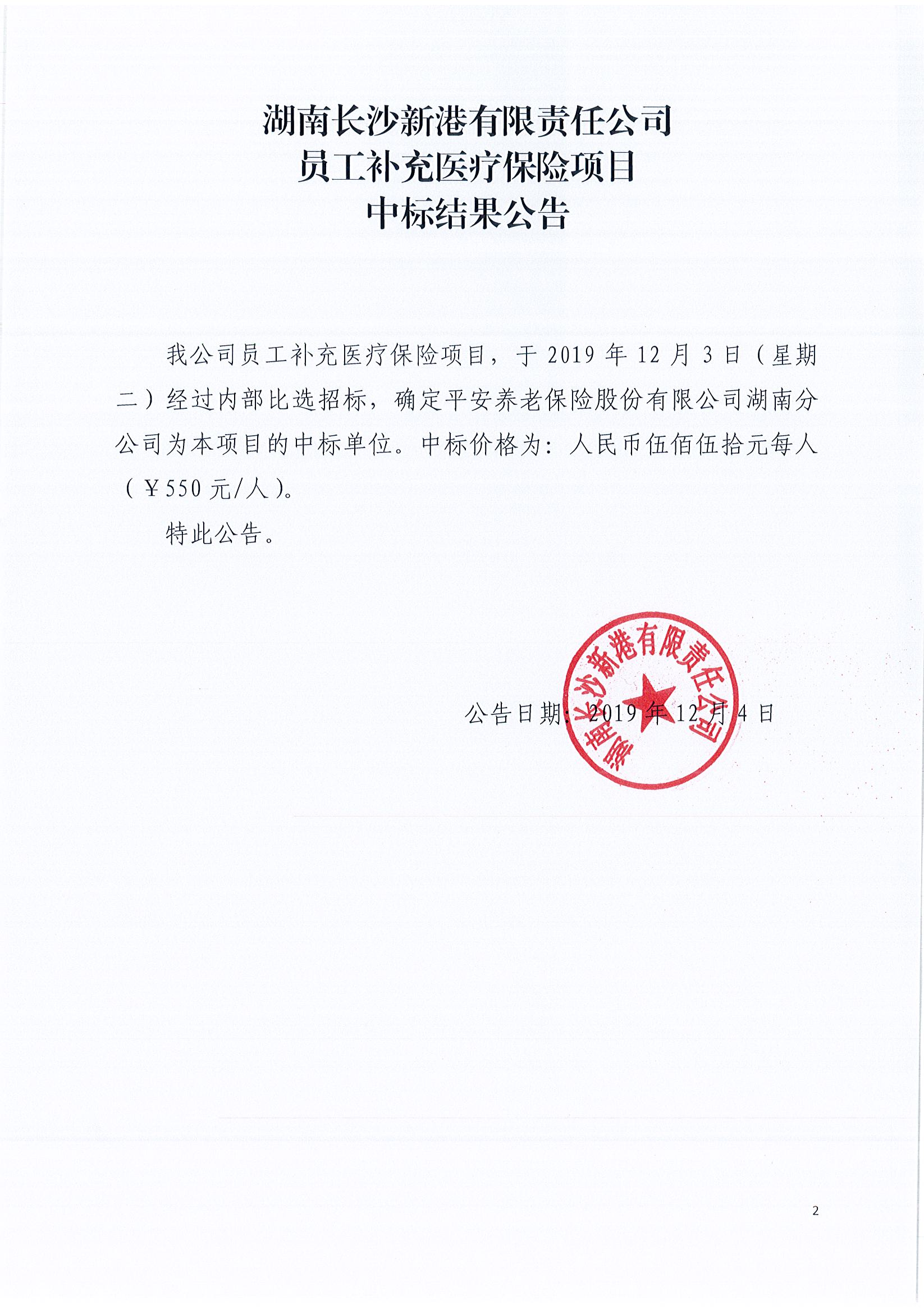 湖南長沙新港有限責(zé)任公司員工補充醫(yī)療保險項目中標(biāo)結(jié)果公告
