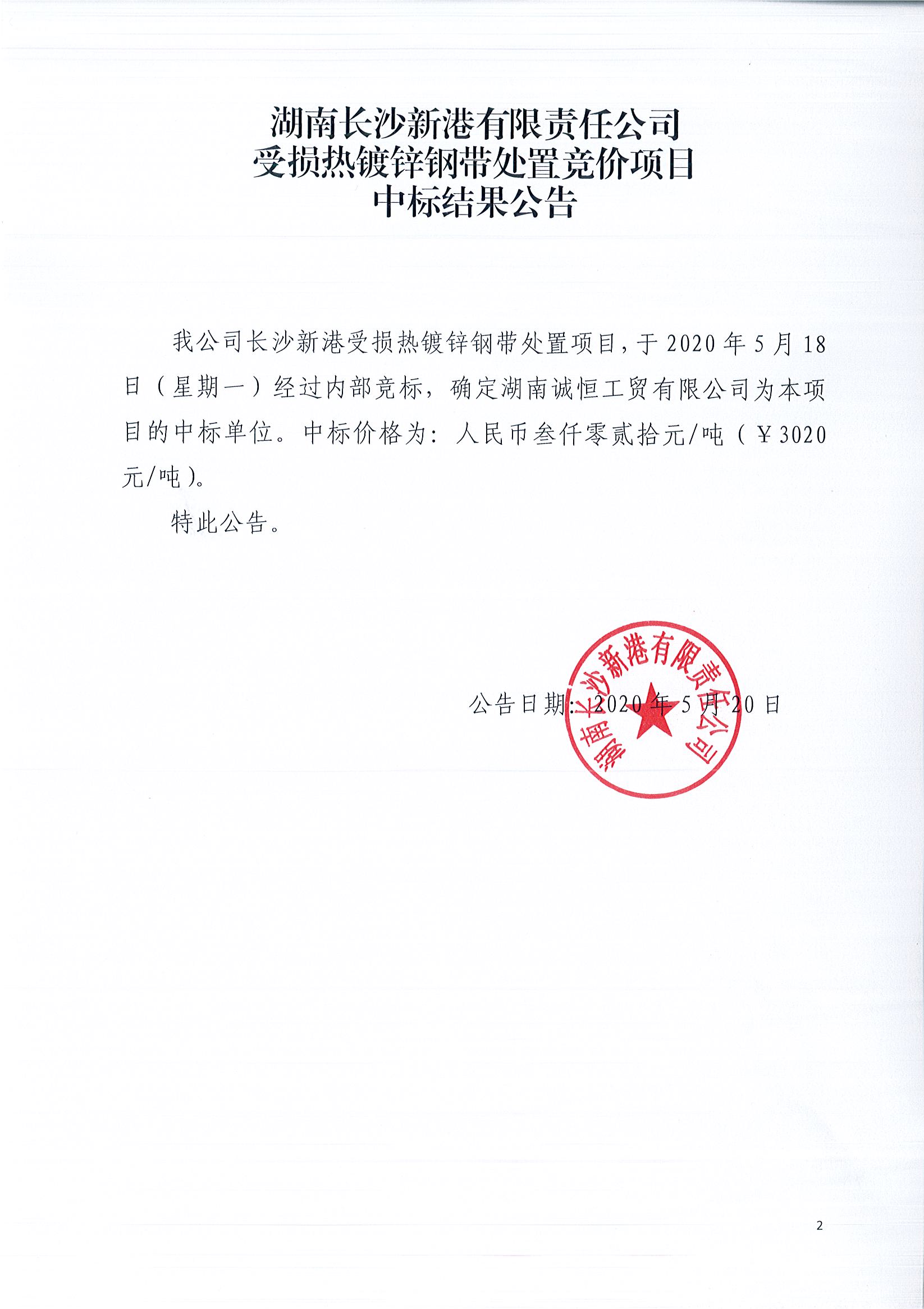 湖南長沙新港有限責任公司受損熱鍍鋅鋼帶處置競價項目中標結(jié)果公告