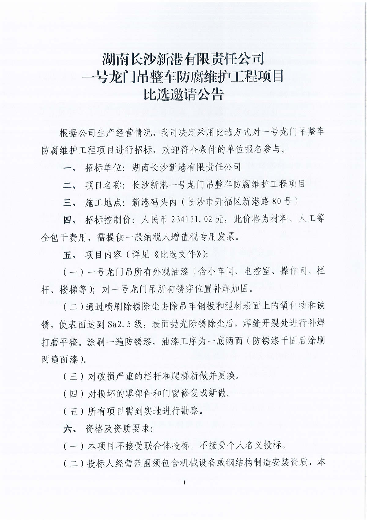 湖南長沙新港有限責(zé)任公司一號龍門吊整車防腐維護(hù)工程項(xiàng)目比選邀請公告