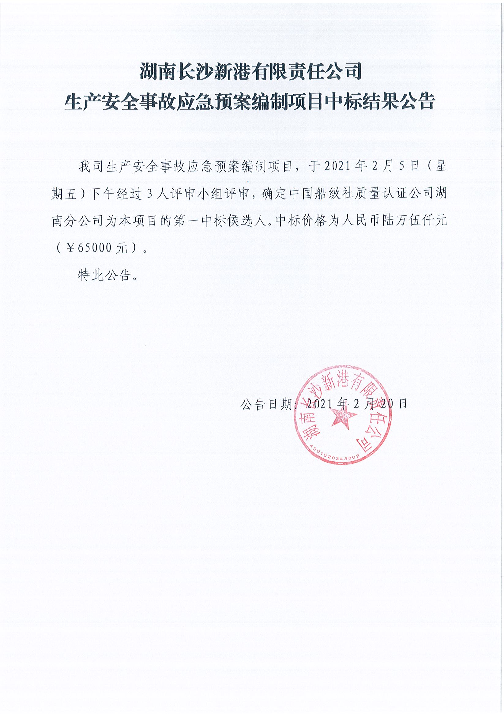 湖南長沙新港有限責(zé)任公司生產(chǎn)安全事故應(yīng)急預(yù)案編制項目中標(biāo)結(jié)果公告