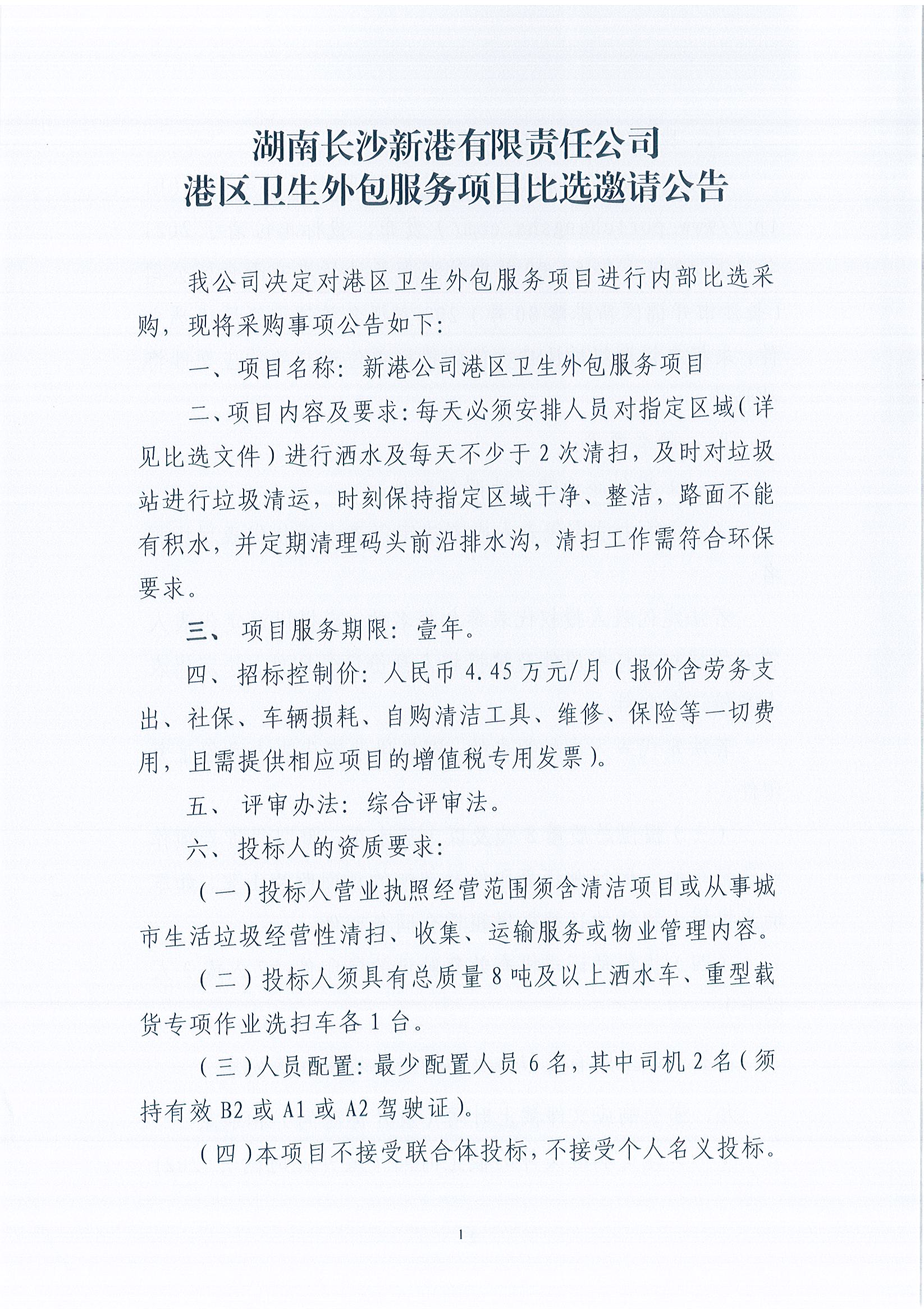 湖南長(zhǎng)沙新港有限責(zé)任公司港區(qū)衛(wèi)生外包服務(wù)項(xiàng)目比選邀請(qǐng)公告
