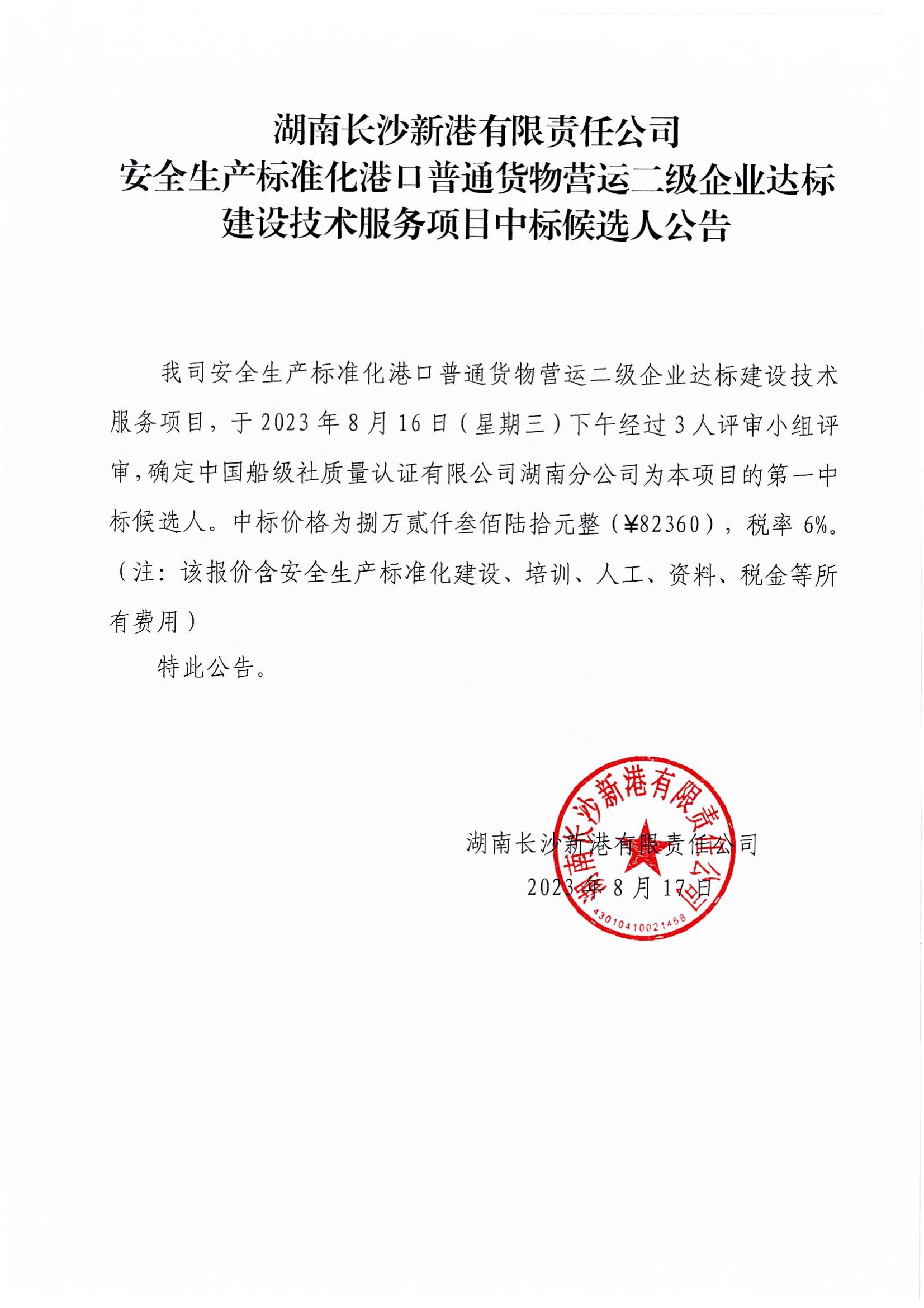 安全生產(chǎn)標(biāo)準(zhǔn)化港口普通貨物營運二級企業(yè)達標(biāo)建設(shè)技術(shù)服務(wù)項目中標(biāo)候選人公告