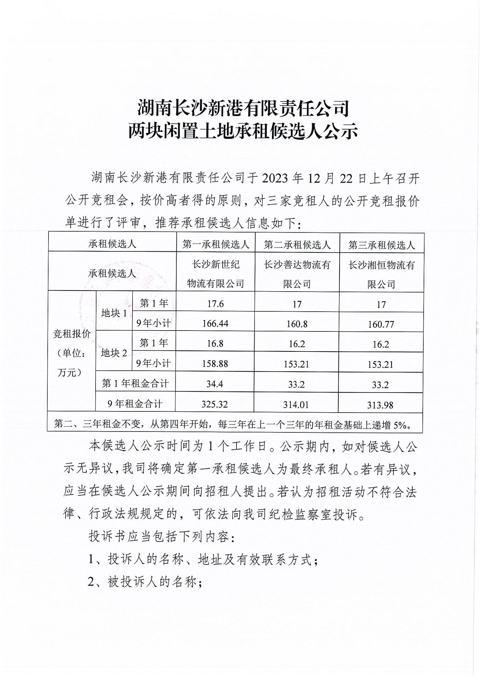 湖南長沙新港有限責(zé)任公司兩塊閑置土地承租候選人公示