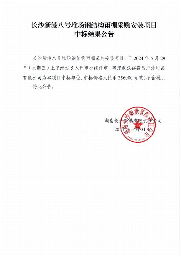 長(zhǎng)沙新港八號(hào)堆場(chǎng)鋼結(jié)構(gòu)雨棚采購(gòu)安裝項(xiàng)目中標(biāo)結(jié)果公示