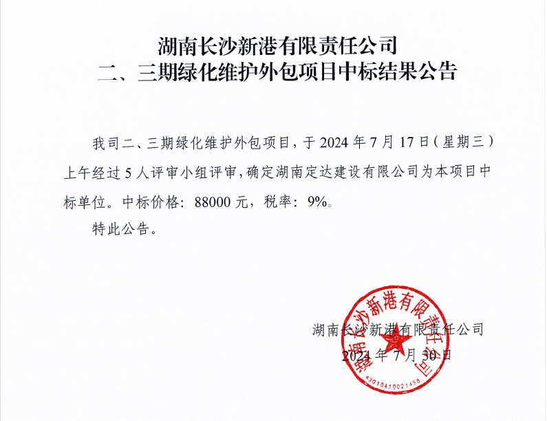湖南長(zhǎng)沙新港有限責(zé)任公司二、三期綠化維護(hù)外包項(xiàng)目中標(biāo)結(jié)果公告