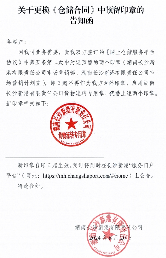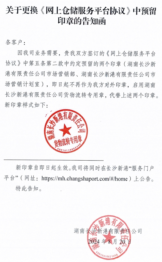 關于更換《倉儲合同》《網(wǎng)上倉儲服務平臺協(xié)議》中預留印章的告知函